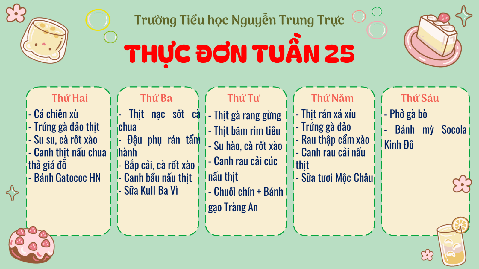 Thực đơn bán trú tuần 24 (Từ 2/3 đến 6/3/2026) năm học 2025 - 2026