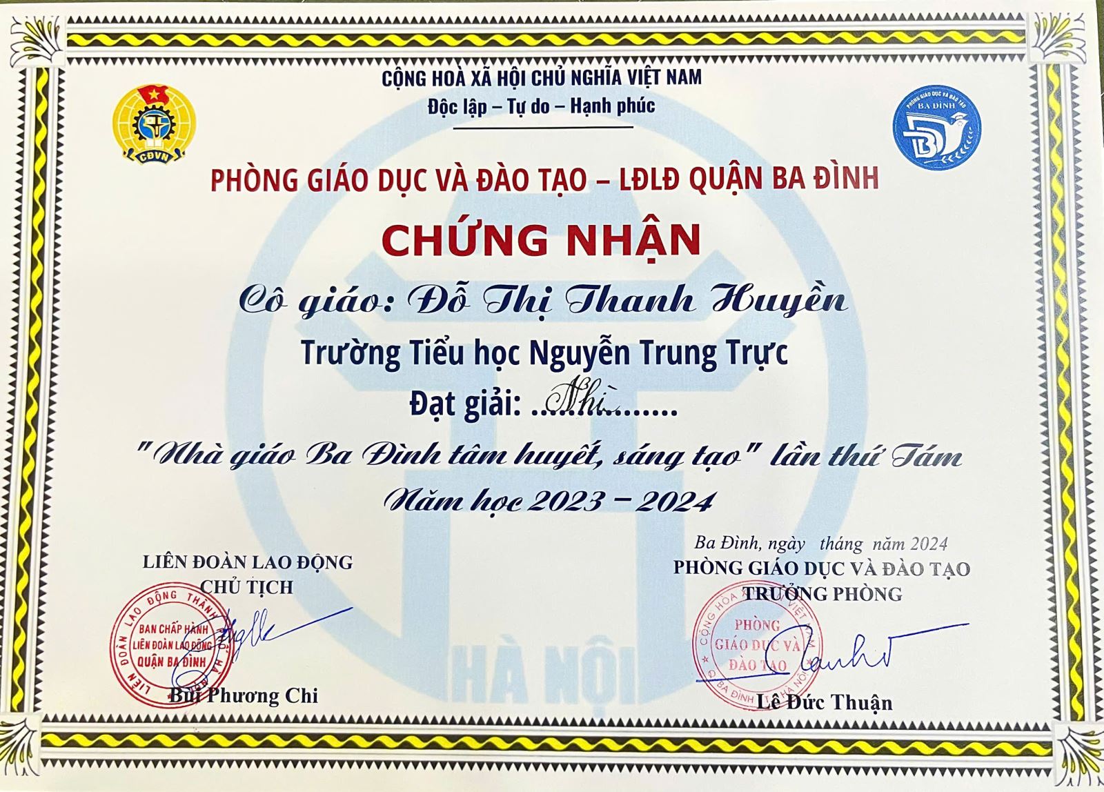 Thông qua vòng chung khảo, cô giáo Đỗ Thị Thanh Huyền đã xuất sắc đạt giải Nhì giải thưởng “Nhà giáo Ba Đình tâm huyết, sáng tạo” lần thứ 8 năm học 2023 – 2024.