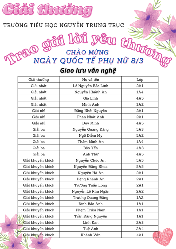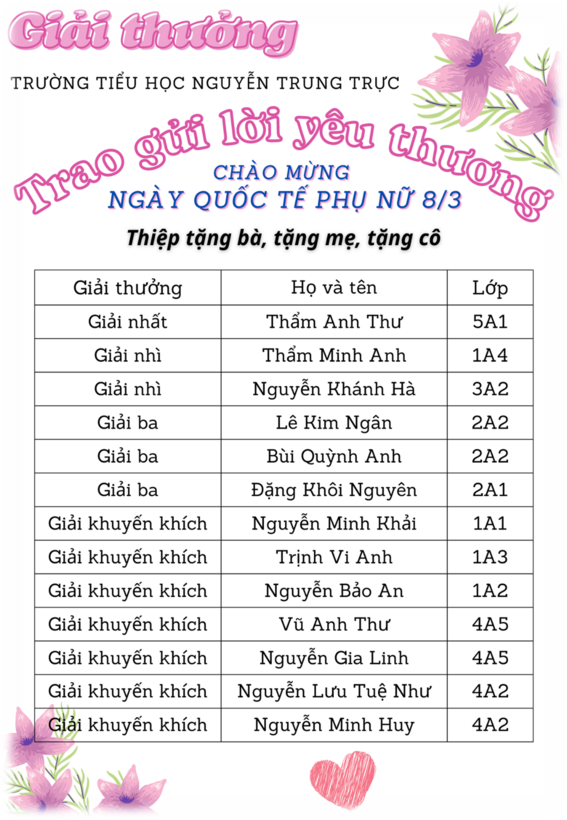 Sau đây là bảng kết quả đạt giải của các con học sinh cho phần thi thiết kế sản phẩm sáng tạo “Làm Bưu thiệp tặng bà, tặng mẹ, tặng cô nhân dịp ngày 8/3” của Liên đội nhà trường: