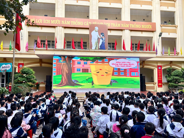 Trường Tiểu học Nguyễn Trung Trực tổ chức tiết sinh hoạt dưới cờ với chuyên đề "Vứt rác đúng nơi quy định."