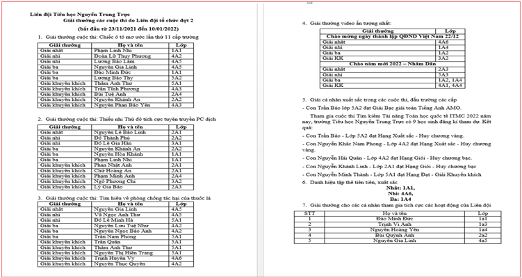 Thế là một phần hai chặng đường của năm học 2021-2022 đã trôi qua nhanh chóng, và giờ đây là những giây phút mà thầy và trò Trường Tiểu học Nguyễn Trung Trực cùng điểm lại những hoạt động trong học kỳ vừa qua, một năm học với sự khởi đầu còn rất nhiều khó khăn khi tình hình dịch bệnh covid 19 đang trong giai đoạn đầy biến động, khó lường. Vượt qua khó khăn, thầy và trò nhà trường đã cùng nhau nỗ lực dạy và học thông qua hình thức trực tuyến đã gặt hái được rất nhiều thành công trong phong trào học tập và hoạt động công tác Đội, phong trào Thiếu nhi Thủ đô, quận và liên đội nhà trường. Sau đây chúng ta cùng điểm lại một số hình ảnh của lễ sơ kết học kì 1 đến từ các lớp: