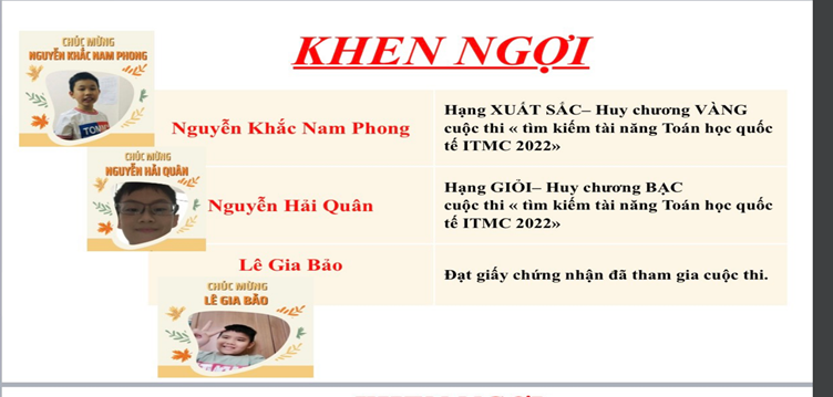 Bên cạnh các hoạt động học tập tích cực, sôi nổi, học sinh nhà trường còn nhiệt tình tham gia các hoạt động, sân chơi bổ ích, lý thú khác do Liên đội và các cấp phát động, tổ chức. Chúng ta cùng nhìn lại các hoạt động và giải thưởng cá nhân, tập thể đã đạt được trong học kì 1 vừa qua:
