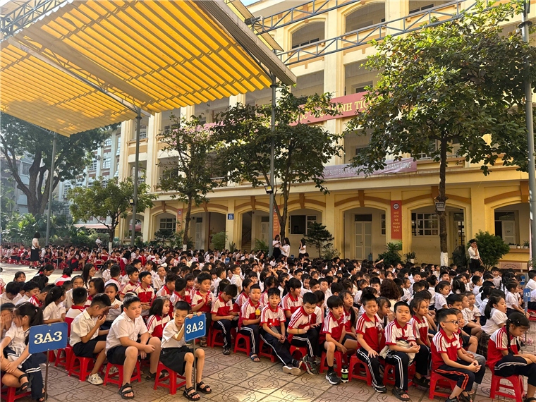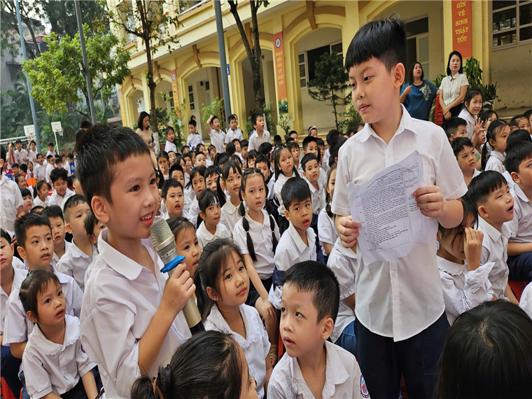 Tiết sinh hoạt dưới cờ bắt đầu với phần nghi lễ chào cờ trang trọng. Sau khi kết thúc phần chào cờ, cô hiệu trưởng Lê Thị Kim Cúc đã phát động chương trình giới thiệu sách tháng 11. Cô chia sẻ rằng việc đọc sách không chỉ giúp học sinh phát triển tư duy, mở mang kiến thức mà còn rèn luyện những đức tính quý báu như kiên trì, lòng yêu nghề, sự cống hiến cho cộng đồng. Đặc biệt, cuốn sách Nghề vương bụi phấn sẽ giúp các em hiểu hơn về nghề giáo - một nghề cao quý, đầy yêu thương nhưng cũng không ít vất vả.