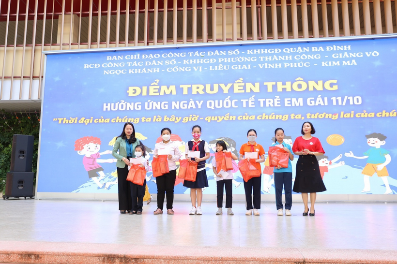 Tại các điểm truyền thông đồng chí Phạm Thị Diễm - Phó Chủ tịch UBND quận -Trưởng BCĐ quận và đồng chí Bùi Văn Hào- Giám đốc TTYT - Phó BCĐ công tác Dân số quận đã trao 17 suất quà cho các em học sinh là trẻ em gái chăm ngoan học giỏi có hoàn cảnh vượt khó. Sau buổi truyền thông, quận tổ chức 02 đoàn xe ô tô, xe máy tuyên truyền lưu động với băng zôn, khẩu hiệu tuyên truyền kỷ niệm Ngày Quốc tế trẻ em gái 11/10 với Chủ đề: “Nâng cao vai trò, vị thế của trẻ em gái góp phần giảm thiểu mất cân bằng giới tính khi sinh” diễu hành trên các tuyến phố chính thuộc quận, được đông đảo nhân dân hưởng ứng và quan tâm.