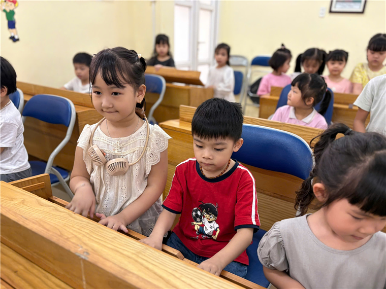 Tiếp theo, các em học sinh Mầm non được các cô giáo hướng dẫn tham quan và làm quen với không gian học tập tại trường. Các em được giới thiệu khu nhà hiệu bộ gồm: phòng làm việc của Ban giám hiệu, phòng hội đồng, phòng y tế, phòng nghệ thuật, phòng tin học, phòng ngoại ngữ và các lớp học khang trang.
