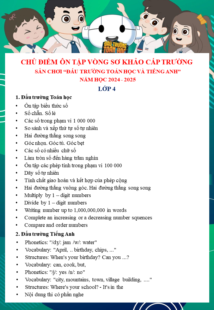 Chủ điểm ôn tập vòng Sơ khảo sân chơi "Đấu trường Toán học và Tiếng Anh" năm học 2024-2025 dành học cho học sinh lớp 4