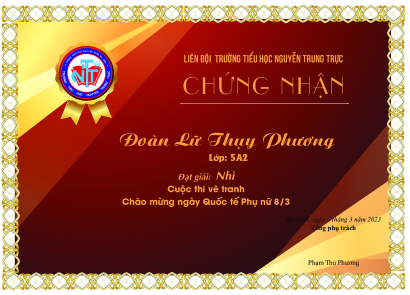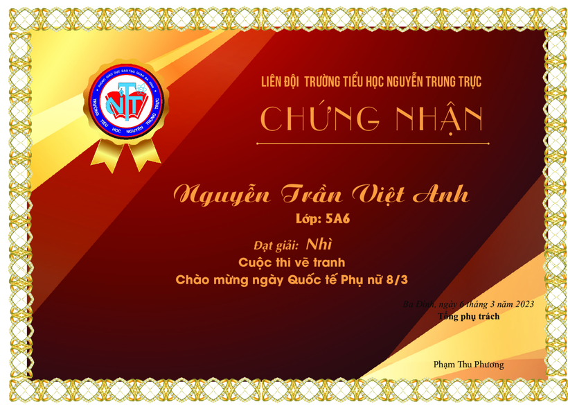 Chúc mừng học sinh Nguyễn Phương Uyên – lớp 5A3 đạt giải Nhì tại chung kết giải thể thao học sinh phổ thông phường Ba Đình năm học 2025–2026