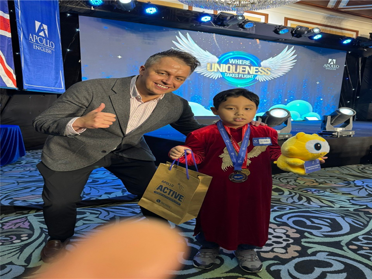 Con Ngô Trí Hiếu chụp ảnh cùng Tổng giám đốc Apollo English Việt Nam
