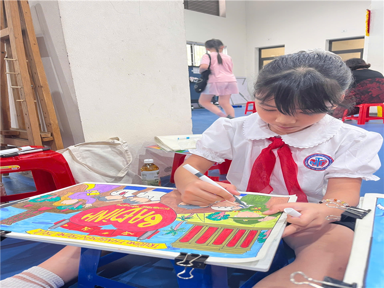 Sau khi tham dự lễ khai mạc. 8h30 phút hai họa sĩ nhí bắt đầu phác họa bức tranh. Hai bạn đều tập trung cao độ cho tác phẩm của mình.