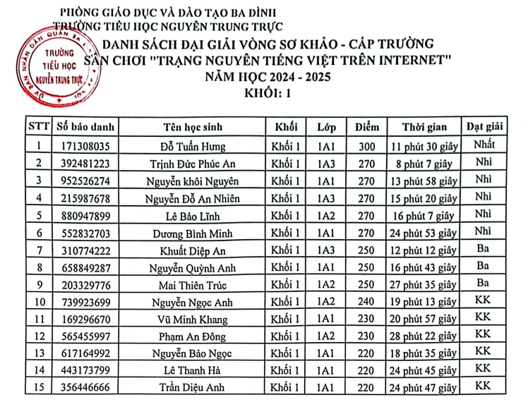 Danh sách xếp giải vòng Sơ loại Khối 1 sân chơi "Trạng Nguyên Tiếng Việt" năm học 2024 - 2025