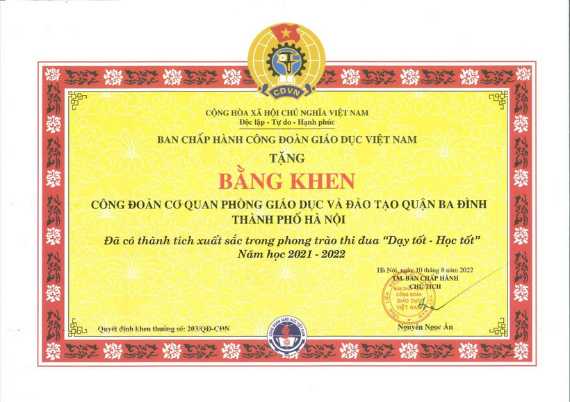 Công đoàn Giáo dục Việt Nam tặng bằng khen Phòng Giáo dục và Đào tạo Ba Đình