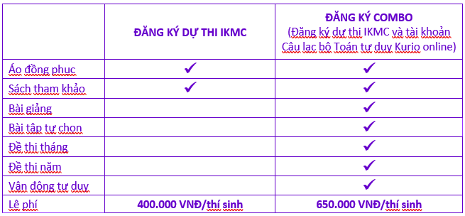 Bao gồm đăng ký thi IKMC 2023 và đăng ký tài khoản full member Câu lạc bộ toán tư duy Kurio 1 năm (phí thường niên 500.000đ/ tài khoản/ học sinh/ năm). Với Kỳ thi IKMC 2023, lệ phí đăng ký combo chỉ còn 650.000đ/thí sinh. Ban tổ chức Kỳ thi IKMC 2023 hi vọng đây sẽ là một kênh trao đổi, tương tác và tiếp cận với toán tư duy; giúp các em học sinh trau dồi và xây dựng niềm đam mê với toán học.