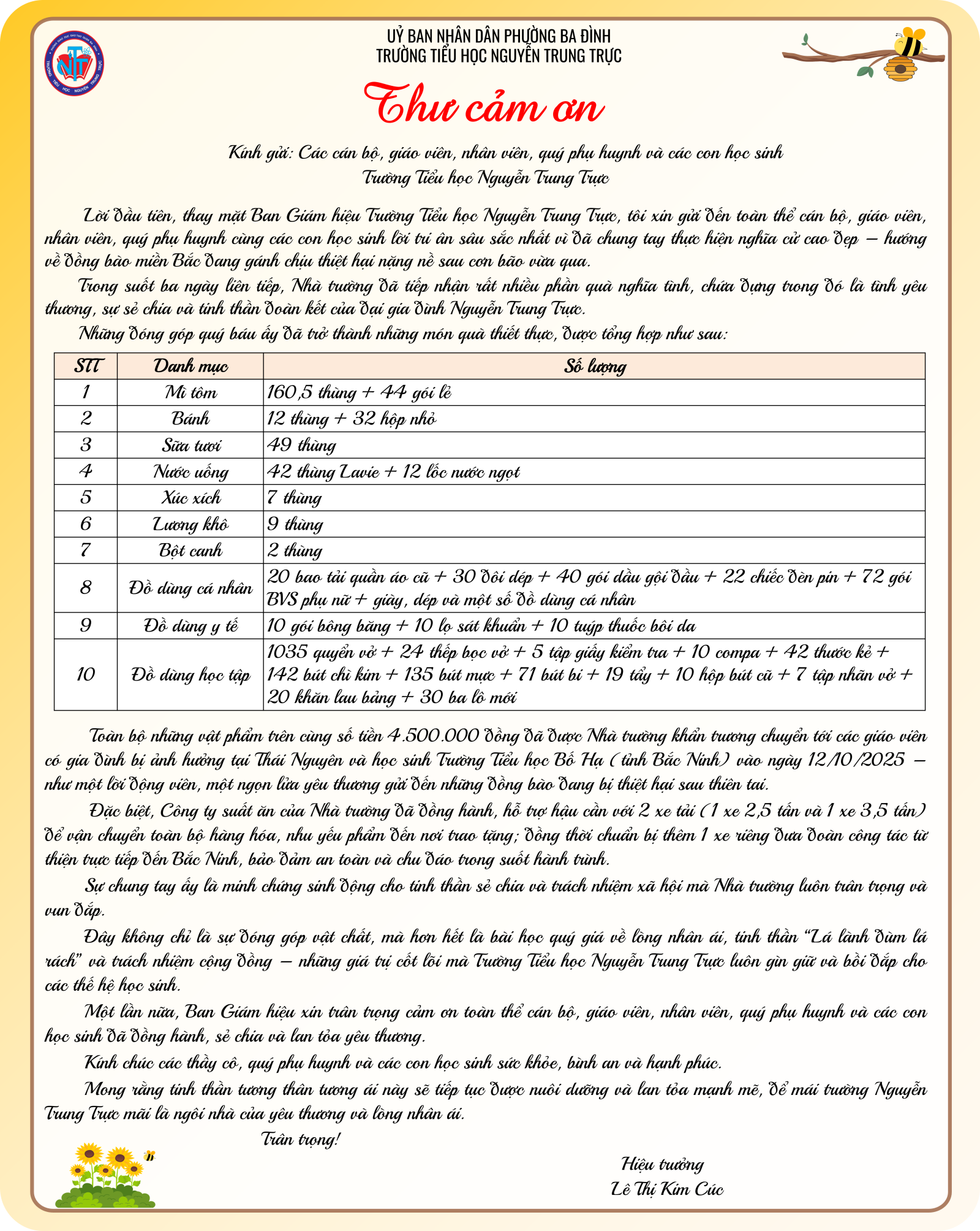 Thư cảm ơn tập thể Trường Tiểu học Nguyễn Trung Trực chung tay hướng về miền Bắc thân yêu