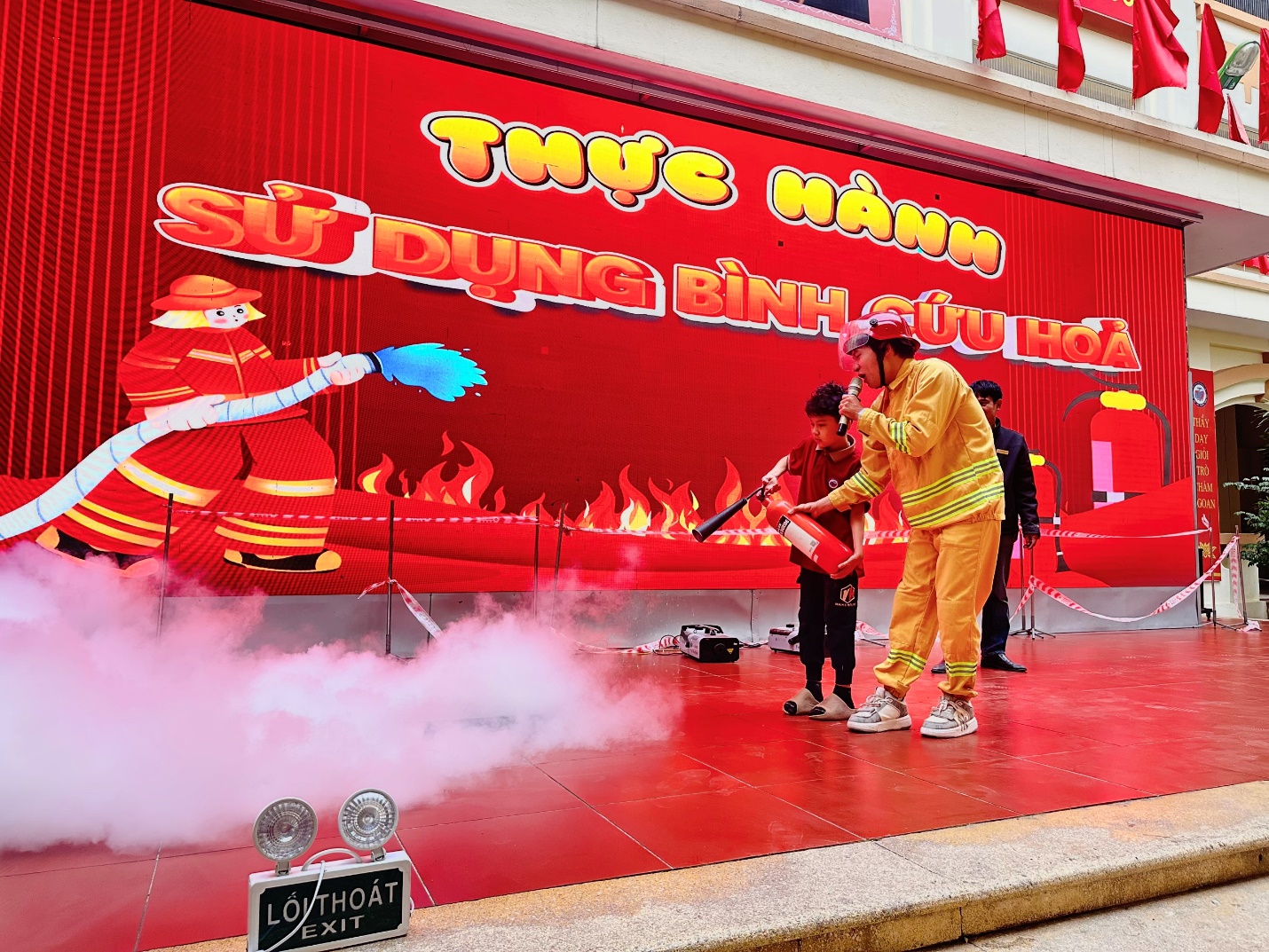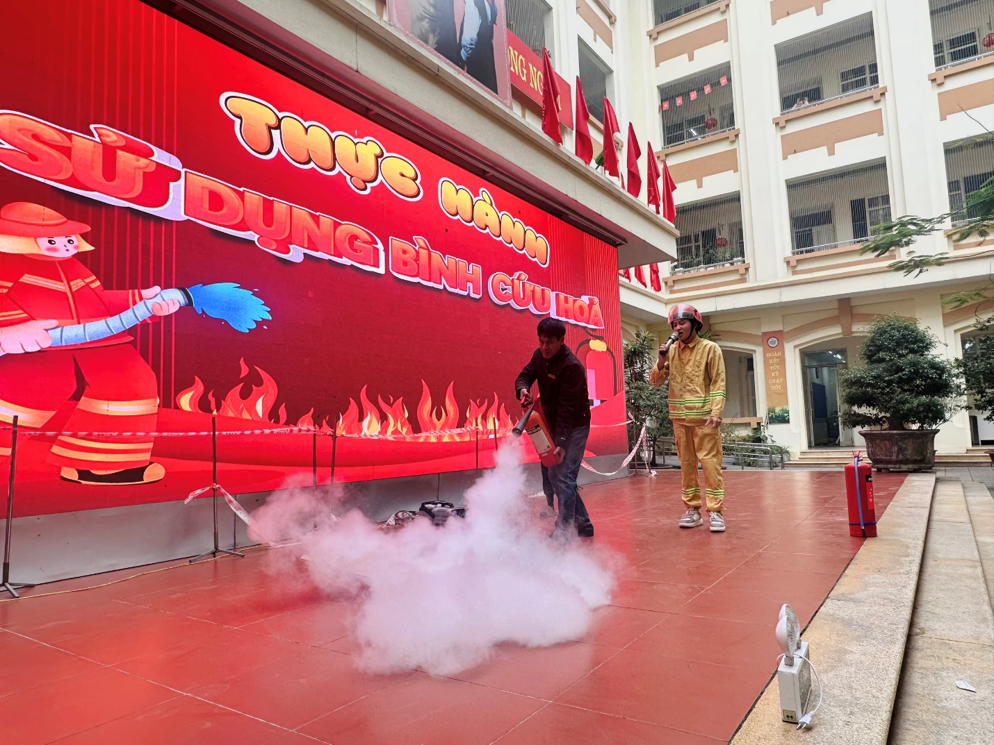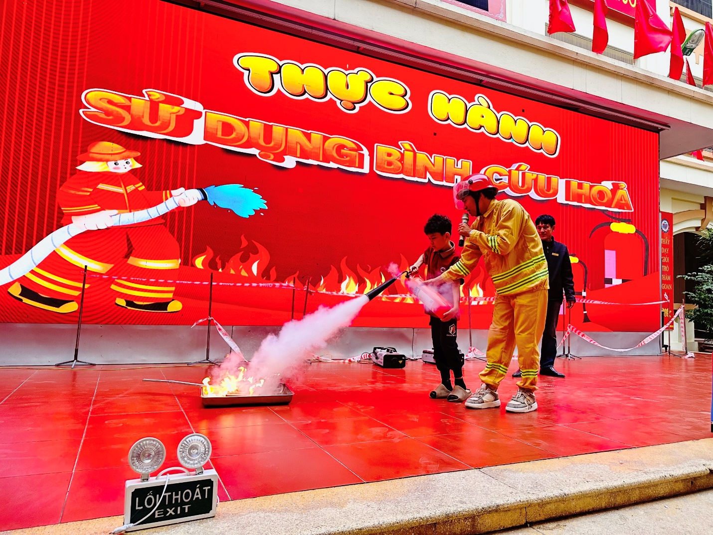 Không chỉ dừng lại ở việc tiếp nhận kiến thức lý thuyết, học sinh còn được hướng dẫn trực tiếp các biện pháp phòng cháy, cách xử lý tình huống và thoát hiểm an toàn khi có cháy xảy ra. Đặc biệt, phần thực hành sử dụng bình chữa cháy đã thu hút sự quan tâm, hào hứng của các em. Dưới sự hướng dẫn tận tình của các chuyên viên, nhiều học sinh được trực tiếp lên thao tác sử dụng bình cứu hỏa, thực hiện các bước an toàn khi dập tắt đám cháy.
