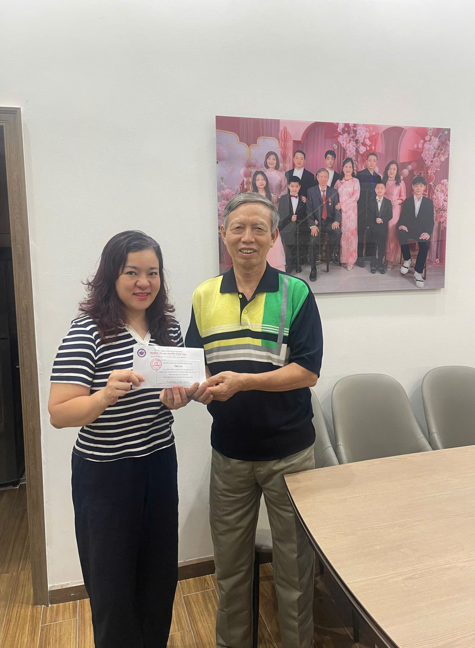 Đồng chí Lê Thanh Tâm đại diện nhà trường trao quà tri ân tới bác Bác Phạm Thanh Long là bố chồng đồng chí