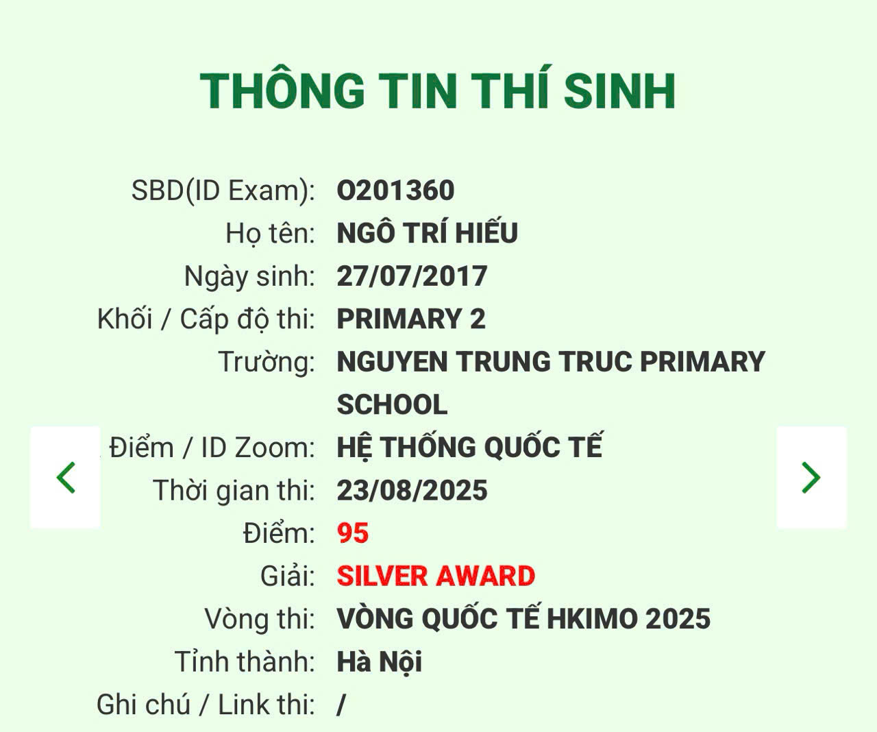 🥈 Huy chương Bạc – Vòng Quốc tế HKIMO 2025 với số điểm 95/100