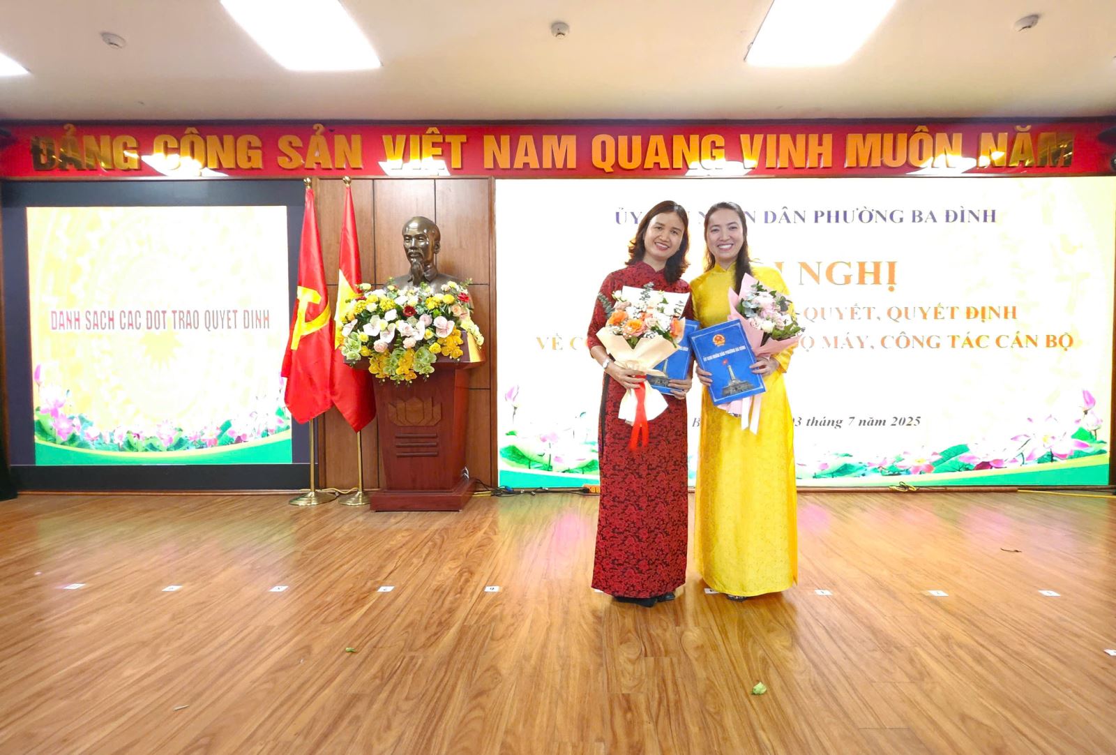Tại Hội nghị, lãnh đạo UBND phường đã công bố các quyết định liên quan đến việc bổ nhiệm lại đội ngũ cán bộ quản lý các trường học trên địa bàn phường sau khi thực hiện sắp xếp đơn vị hành chính theo Nghị quyết của Quốc hội. Theo đó, các quyết định bổ nhiệm trước đây do UBND quận Ba Đình ban hành, nay được UBND phường Ba Đình ký lại nhằm đảm bảo tính pháp lý, tính liên tục và thống nhất trong công tác tổ chức và quản lý nhà trường.
