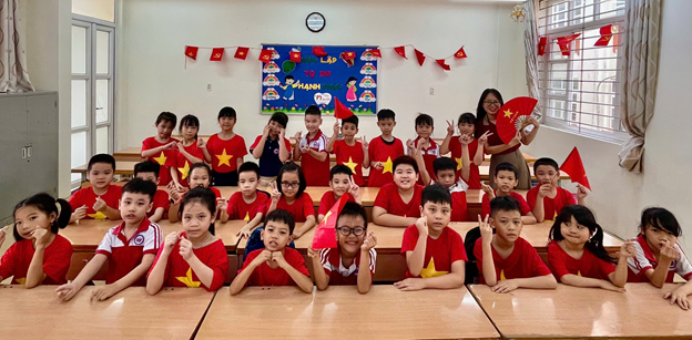 Cô trò lớp 4A3 cùng nhau khoác lên mình sắc đỏ rực rỡ của cờ hoa Tổ quốc