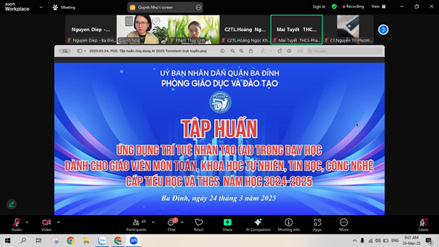 Ngày 24/3, giáo viên Tin học trường Tiểu học Nguyễn Trung Trực tham gia tập huấn trực tuyến do Phòng GD&ĐT Ba Đình tổ chức về ứng dụng AI trong giảng