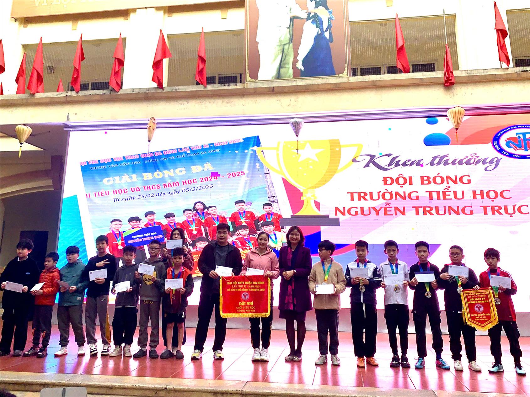 Ban giám hiệu trường Tiểu học Nguyễn Trung Trực trao phần thưởng cho đội bóng nhí nhà trường