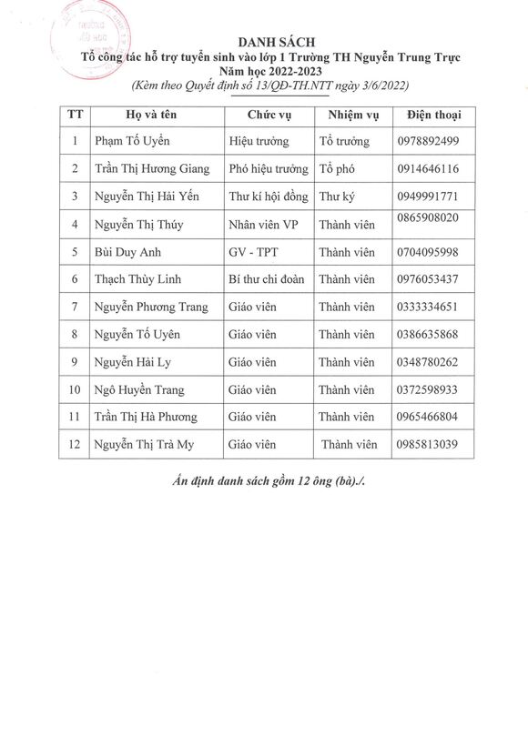 Danh sách tổ công tác tuyển sinh lớp 1 trường TH Nguyễn Trung Trực